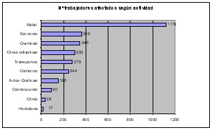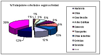 Por sectores, el mayor número de trabajadores afectados por las regulaciones pertenece a la industria (65,4%), particularmente a empresas del subsector del Metal. Le siguieron los servicios, con un 12% del total de trabajadores afectados, y los transportes, con el 8% del total.