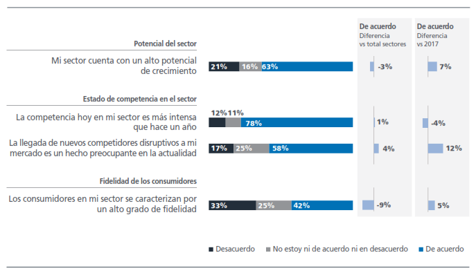 La consecuencia inmediata de que los expertos del sector de Automoción valoren de manera positiva el futuro próximo para su negocio es que seis de cada diez (61%) consideran que el momento actual es adecuado para asumir más riesgos en sus estrategias de crecimiento, aunque dicha proporción es cinco puntos inferior a la media de los sectores estudiados. Y dos tercios (67%) creen que es buen momento para invertir en nuevos productos, aunque de nuevo siete puntos por debajo de la media. Por otra parte, sólo el 38% considera adecuado el momento para una expansión geográfica –dieciséis puntos por debajo de la media- y la mitad considera oportuno el incremento de la inversión en marketing y publicidad, a gran distancia (catorce puntos) de la media. En todas las dimensiones, además, se han medido retrocesos respecto a lo consignado en el informe de 2017.