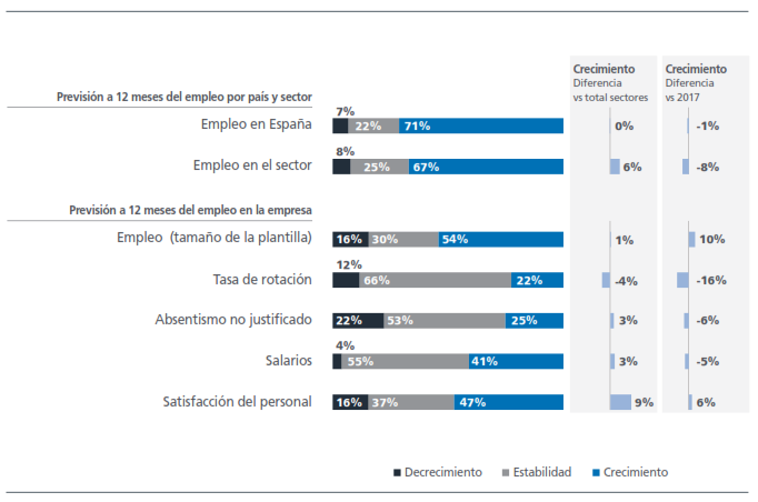 Más de la mitad de las empresas del sector prevé estabilidad respecto a los salarios (el 55%) y más de un tercio ven estable la satisfacción del personal (el 37%) en los próximos doce meses, mientras que 4 de cada 10 expertos del sector anticipan crecimientos en el nivel de remuneración (el 41%, cinco puntos menos que lo medido hace un año) y casi la mitad en la satisfacción de su personal (el 47%), mostrando un optimismo más elevado que en el promedio de todos los sectores en ambas dimensiones.