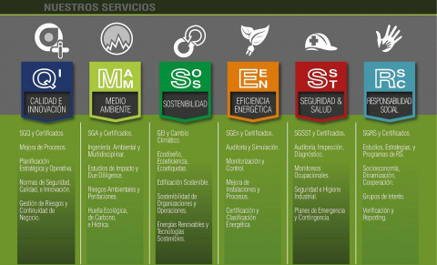 Les diferencia su capacidad de integración de servicios especializados, y las soluciones completas y apoyo en: sistemas de gestión y certificados, normas ISO, calidad, innovación y mejora de procesos, sostenibilidad y gestión ambiental, huella de carbono y eficiencia energética, seguridad y salud ocupacional, seguridad de la información, compliance, antisoborno, prevención de blanqueo, responsabilidad social corporativa, estudios de impacto ambiental, residuos y economía circular, due diligence ambiental y social, energías renovables y tecnologías sostenibles.