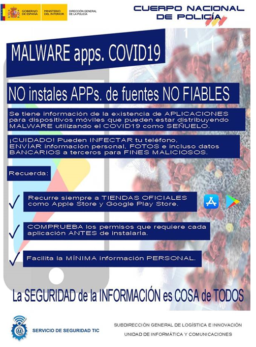 La Red Azul del Cuerpo Nacional de Policía informa que existen aplicaciones para móviles que pueden estar distribuyendo MALWARE utilizando el COVID-19 como señuelo, las cuales pueden infectar el teléfono, enviar información personal, fotos, e incluso datos bancarios a terceros para fines maliciosos.