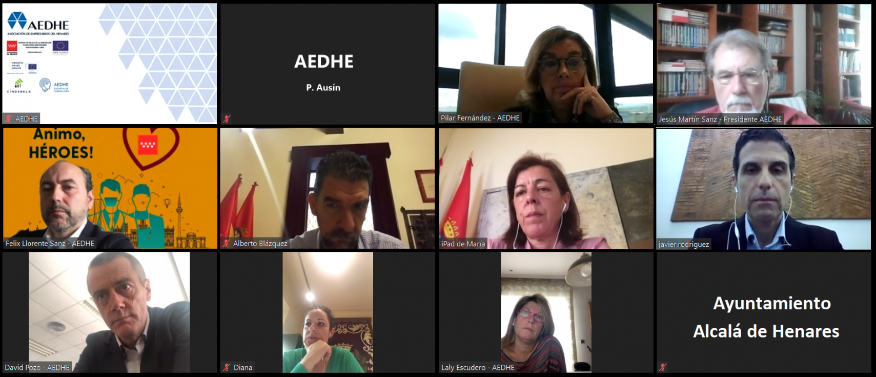 A la reunión, que se ha llevado a cabo en formato digital, han asistido Javier Rodríguez Palacios, alcalde de Alcalá de Henares; Jesús Martín Sanz, presidente de AEDHE; Alberto Blázquez Sánchez, primer Teniente Alcalde y Concejal Delegado Urbanismo, Movilidad, Seguridad Ciudadana, Comunicación Institucional, Deportes; María Aranguren Vergara, segundo Teniente Alcalde y concejal Delegada de Cultura, Festejos, Casco Histórico; Diana Díaz del Pozo, concejala Delegada de Hacienda, Educación, Patrimonio; Laly Escudero Ossorio, vicepresidenta y Tesorera de AEDHE; Félix Llorente Sanz, vicepresidente de AEDHE; David Pozo Fernández, vicepresidente de AEDHE; y Pilar Fernández Rozado, secretario General de AEDHE.