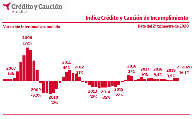El comportamiento del Índice Crédito y Caución de Incumplimiento muestra un incremento interanual de los niveles de impago en España del 16% en el segundo trimestre de 2020. El Índice de Incumplimiento, elaborado por la aseguradora de crédito líder del mercado español, señala el signo y la intensidad de la evolución de los impagos que sufre el tejido empresarial ante el entorno económico.