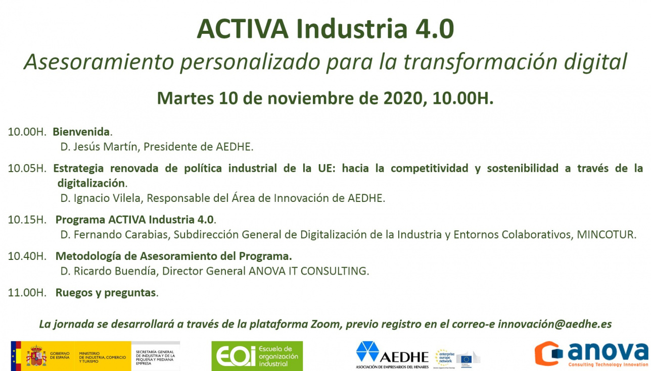 Para más información, el próximo martes 10 de noviembre, junto con MINCOTUR, EOI Y ANOVA organizan jornada digital informativa sobre «El Programa Activa Industria 4.0, donde se ampliarán los detalles sobre la participación de las empresas, la financiación requerida, los requisitos necesarios para su financiación, plazos y servicios de asesoramiento. El evento digital tendrá lugar a las 10:00h y las inscripciones deberán realizarse a través del correo electrónico innovacion@aedhe.es – MÁS INFORMACIÓN DE LA JORNADA – clic aquí