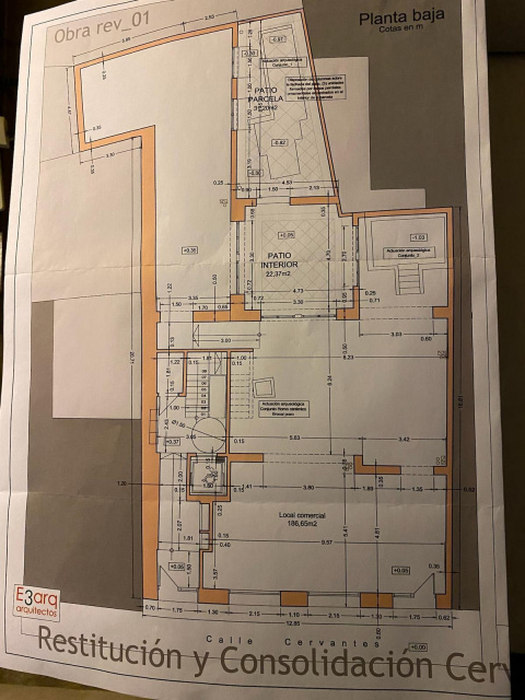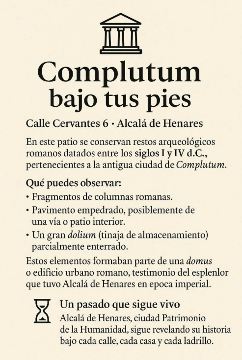 En pleno Casco Histórico de Alcalá de Henares, frente al Teatro Cervantes y en el paso natural que conecta Calle Mayor con la zona de Santiago, acaba de quedar disponible un local que no encaja en la categoría de “uno más”. No solo por estar en la Calle de Cervantes, 6 —una de las arterias con mayor tránsito peatonal y vida cultural constante—, sino porque en su propia configuración integra un elemento patrimonial excepcional: en el patio se conservan y se han musealizado restos arqueológicos romanos, datados entre los siglos I y IV d. C., vinculados a la antigua Complutum.