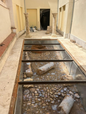 El inmueble, rehabilitado íntegramente, incorpora una intervención arqueológica que no es decorativa ni anecdótica: se han puesto en valor piezas y estructuras como un gran dolium (tinaja de almacenamiento), el brocal de un pozo y restos parciales de un conjunto de columnas, delimitados en una “ventana arqueológica” junto a un pavimento empedrado asociado a una vía o patio interior, además de la reconstrucción de tres columnas en el propio patio. A ello se suma un detalle que refuerza el carácter histórico del conjunto: se ha recuperado y mantenido el acceso original al local, asociado a su construcción primitiva en torno al siglo XIV.